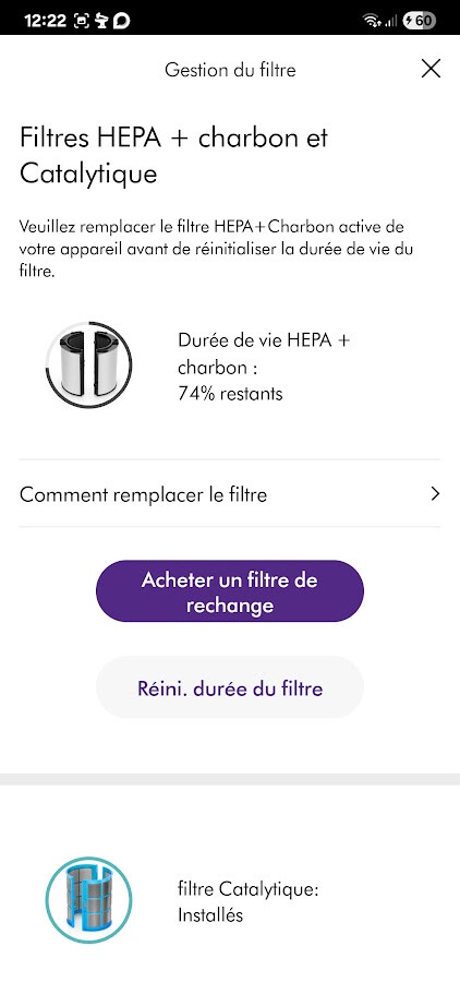 Si je passe par l’appli Dyson et que je clique sur un de mes filtres je tombe sur ça :